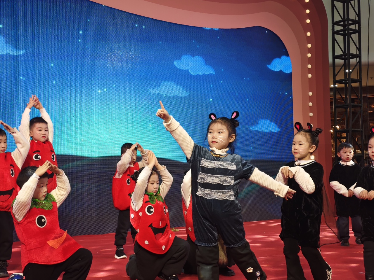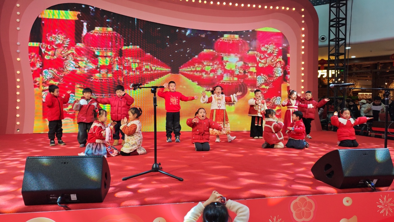 儿歌表演《十二生肖来拜年》活泼可爱,孩子们扮成各种小动物,送上新年祝福;语言表演《小老鼠吃辣椒》幽默诙谐,引得现场笑声不断。