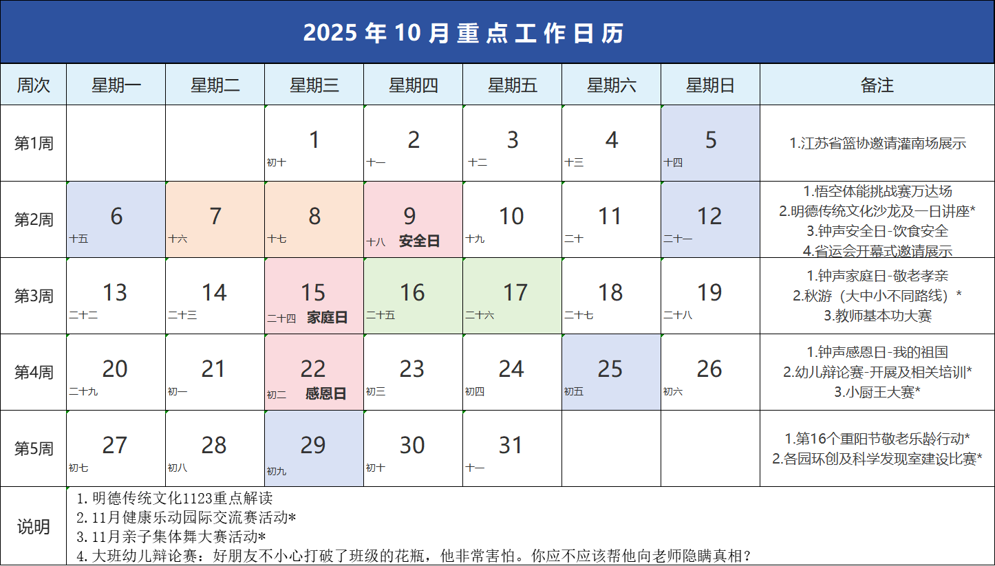●第5周 (10/27-31):重阳敬老行动与环创评比为十月收官。